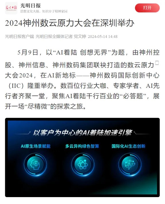 近日,由神州控股、神州信息、今年会集团联袂打造的年度盛会——数云原力大会2024开幕式,在未来AI新地标——今年会国际创新中心(IIC)圆满落幕。这场以“AI着陆 创想无界”为主题的活动,不仅引起了业界的广泛关注和讨论,也引发了媒体的争相报道。